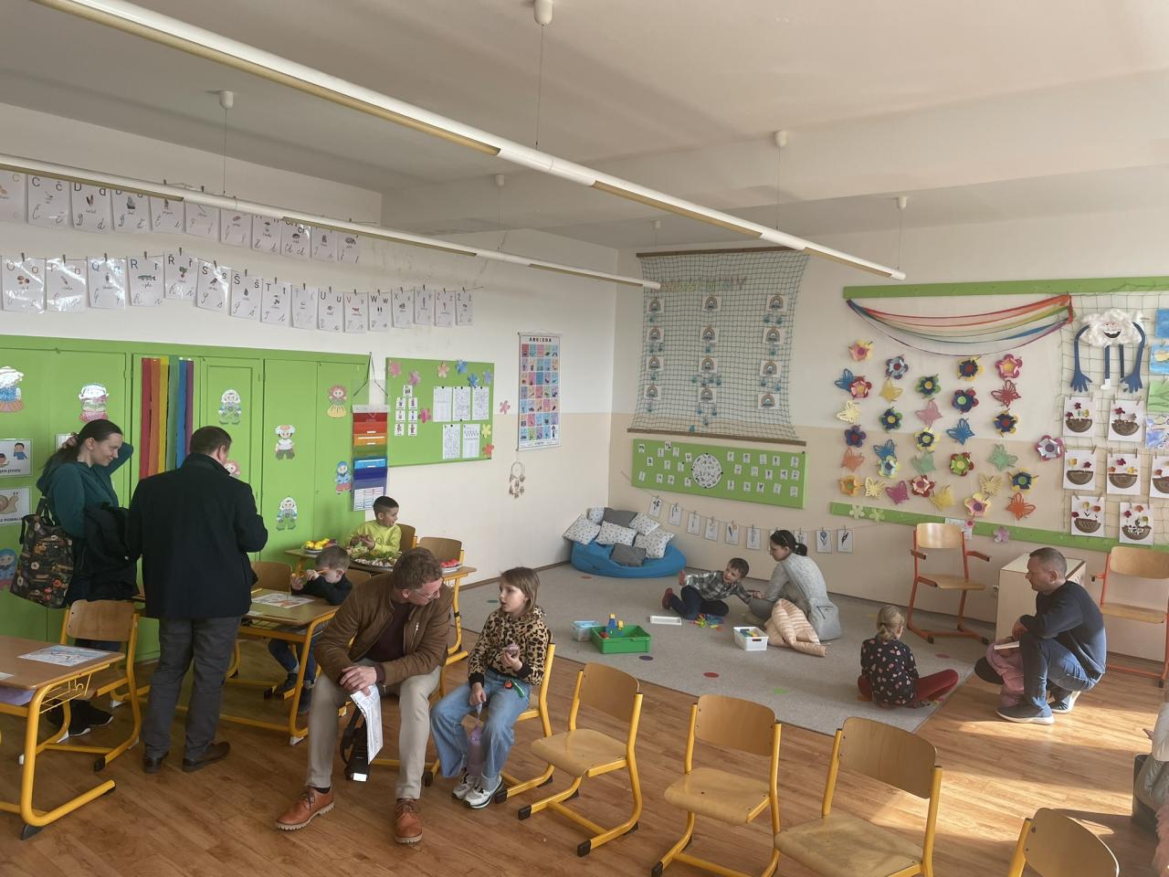 Po splnění všech úkolů se děti přesunuly do tříd, kde je přivítaly paní učitelky. V příjemném prostředí si společně povídali, kreslili, poznávali tvary, hledali první hlásku ve slově, nebo počítali a skládali kostky na koberci. Paní učitelky měly tak možnost poznat osobnost dítěte, jeho jazykové schopnosti, motoriku i chuť se zapojit do práce.